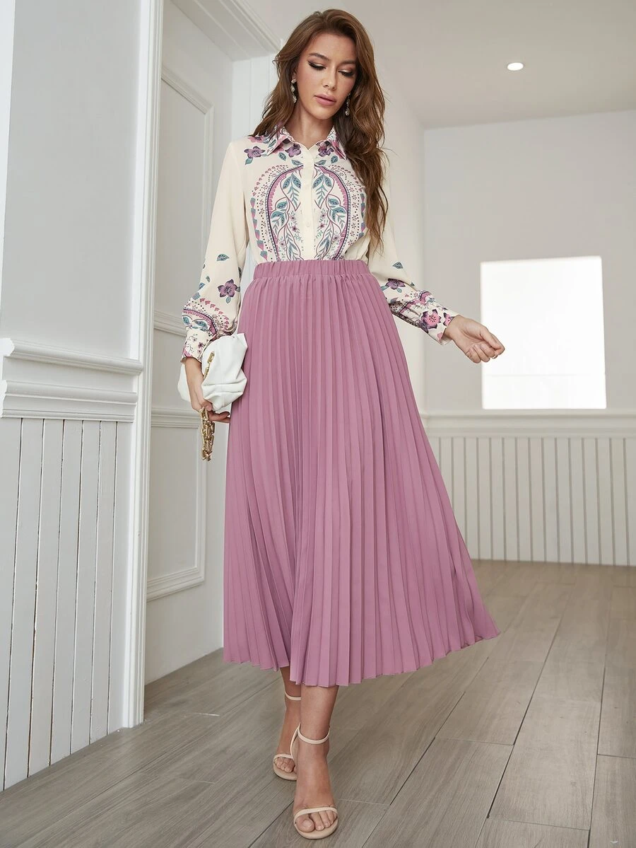 SHEIN Mulvari Floral Print Blouse & Pleated Skirt