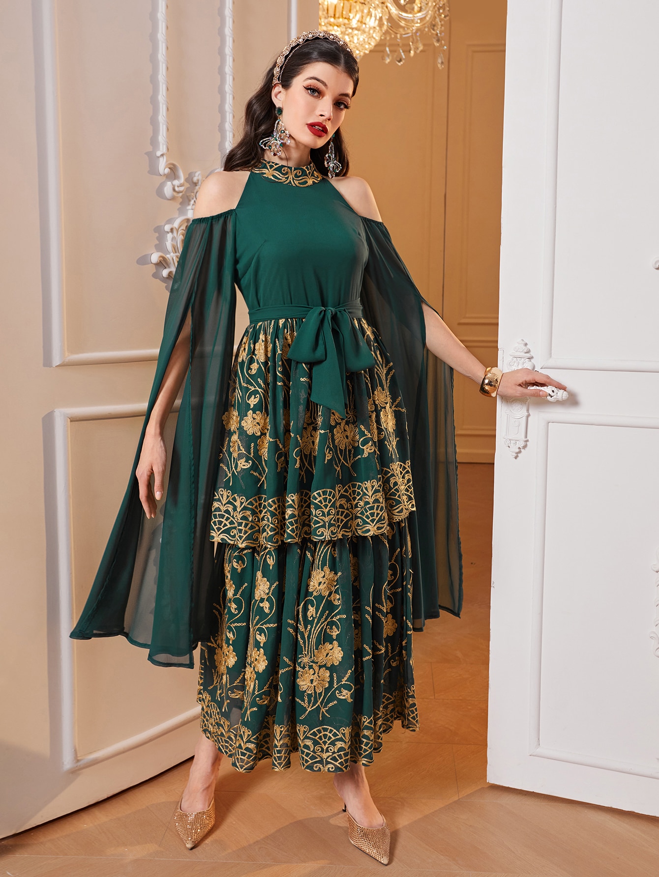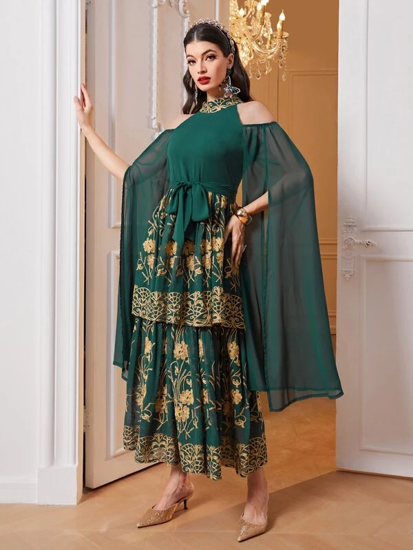 SHEIN Najma Floral Print Cold Shoulder Belted Dress
