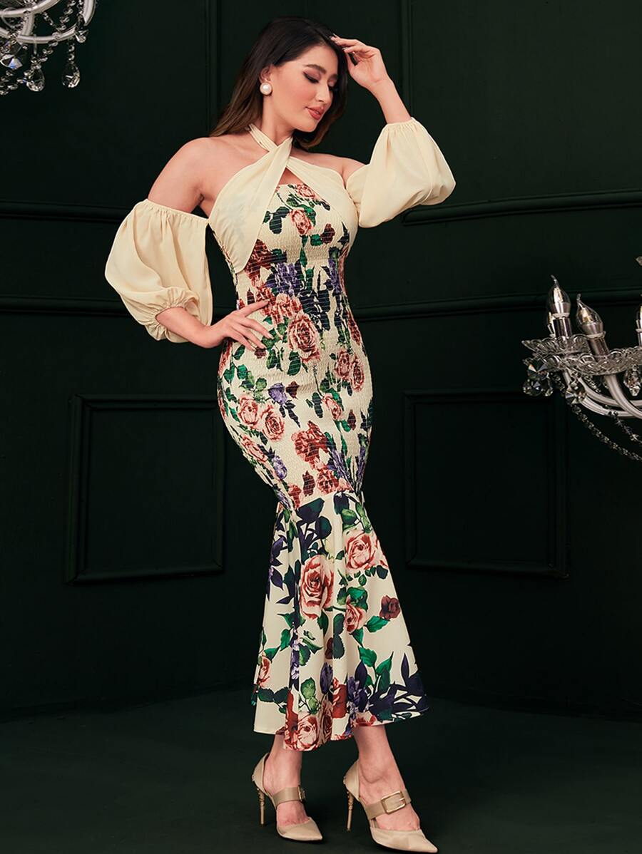 SHEIN Modely Floral Print Cold Shoulder Lantern Sleeve Shirred Detail Mermaid Hem Dress