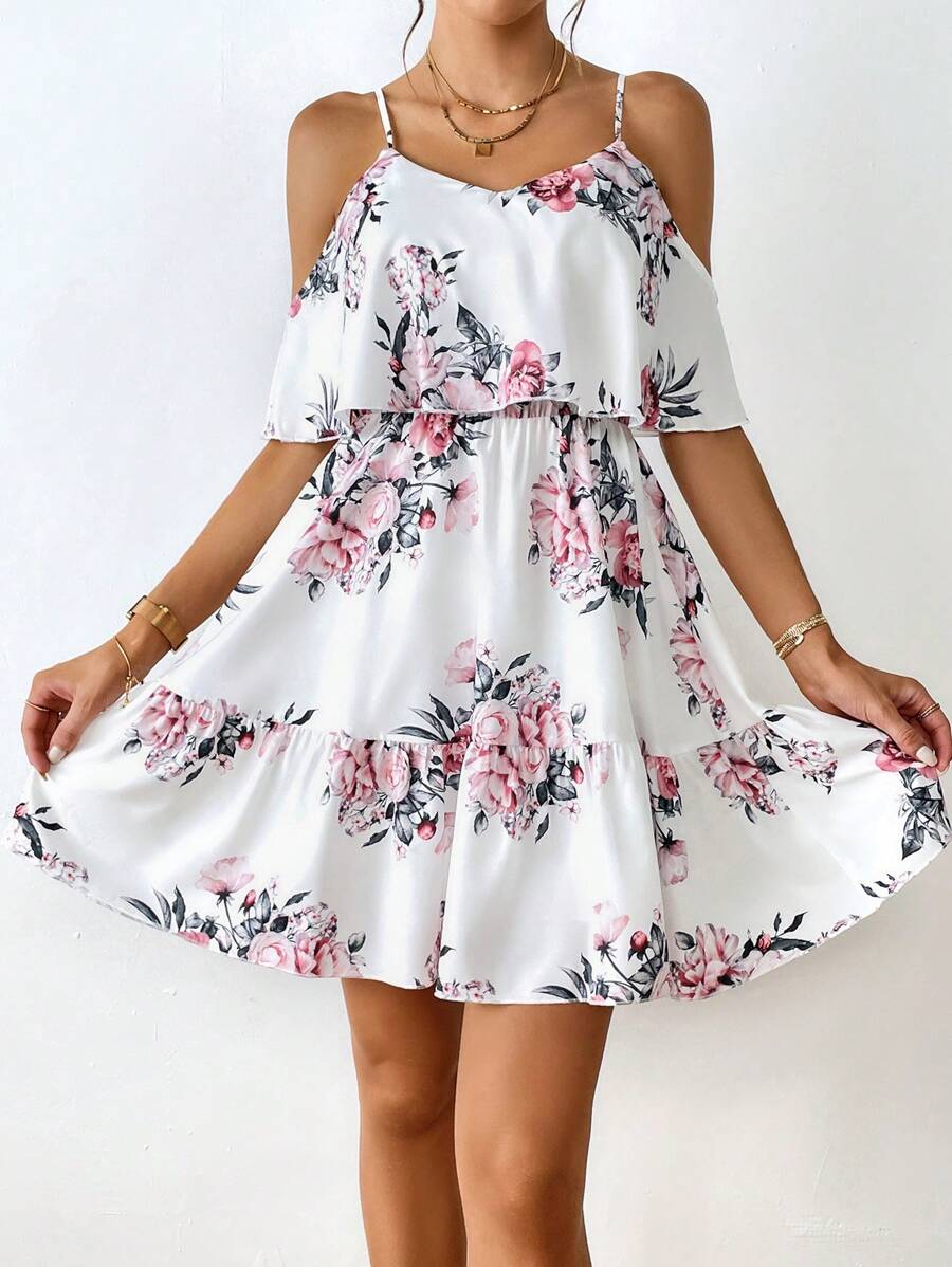 SHEIN Clasi Floral Print Cold Shoulder Ruffle Hem Dress