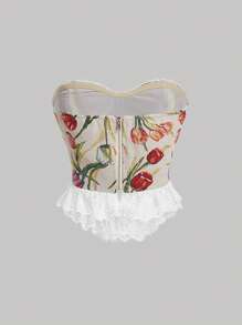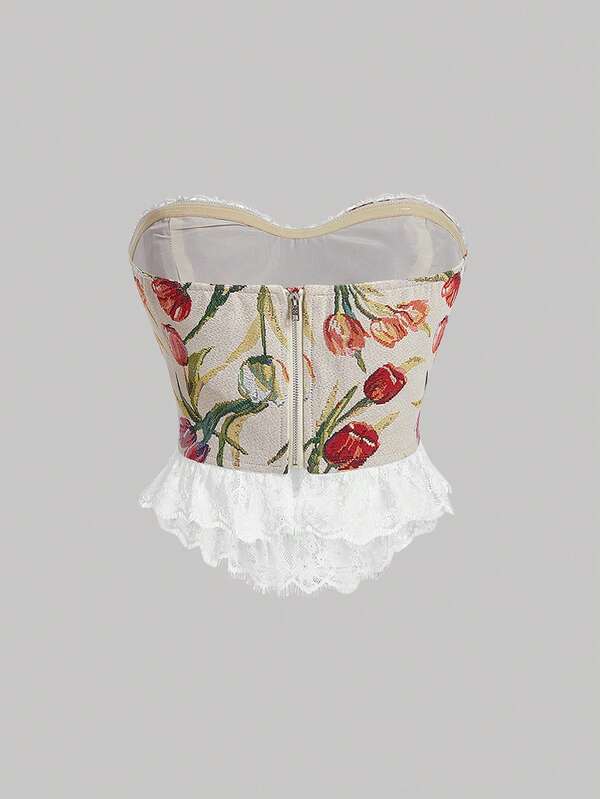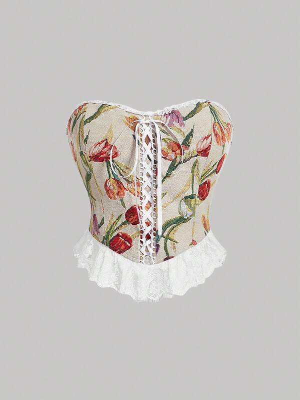 SHEIN MOD Floral Print Lace Up Front Contrast Lace Ruffle Hem Tube Top