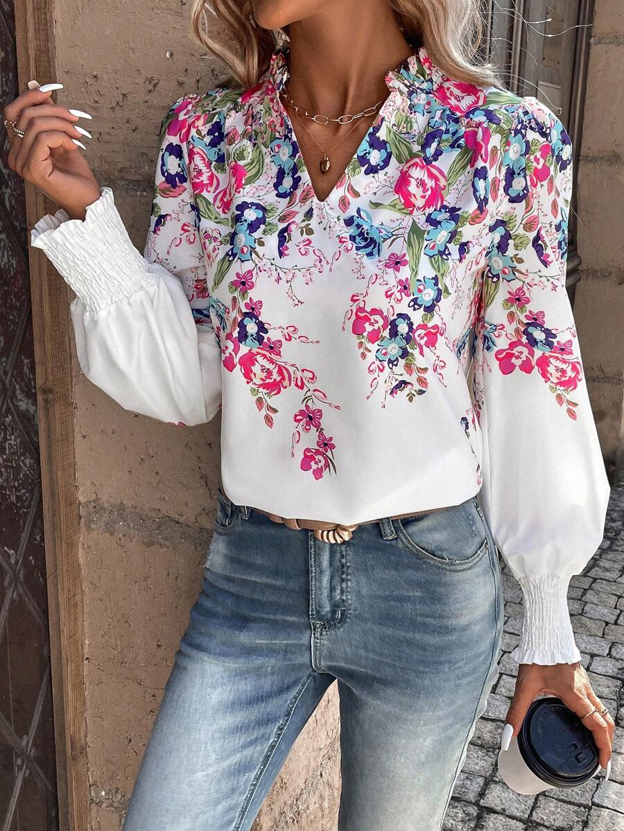 SHEIN Essnce Floral Print Notched Neckline Lantern Sleeve Blouse