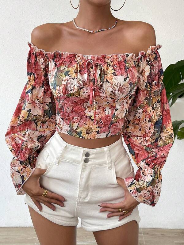 SHEIN VCAY Floral Print Off Shoulder Flounce Sleeve Crop Blouse