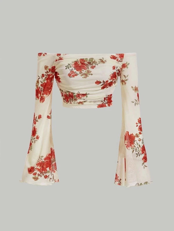 SHEIN MOD Floral Print Off Shoulder Flounce Sleeve Crop Tee