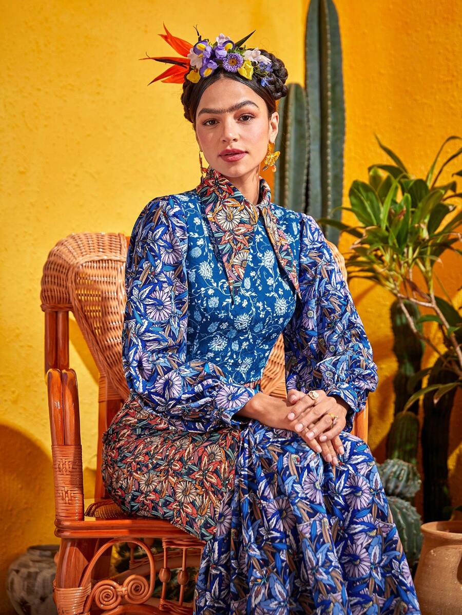 Frida Kahlo X SHEIN X Designer Pompi García Floral Print Ruffle Hem Sleeveless Dress Without Blouse