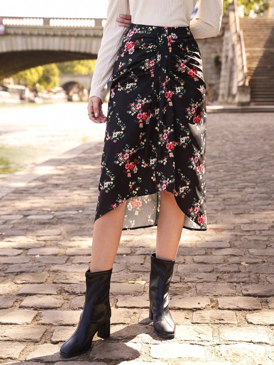 SHEIN Frenchy Floral Print Ruffle Trim Asymmetrical Hem Skirt