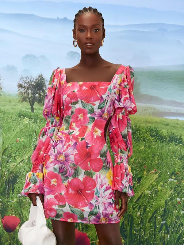 SHEINNeu Floral Print Shirred Detail Flounce Sleeve Dress