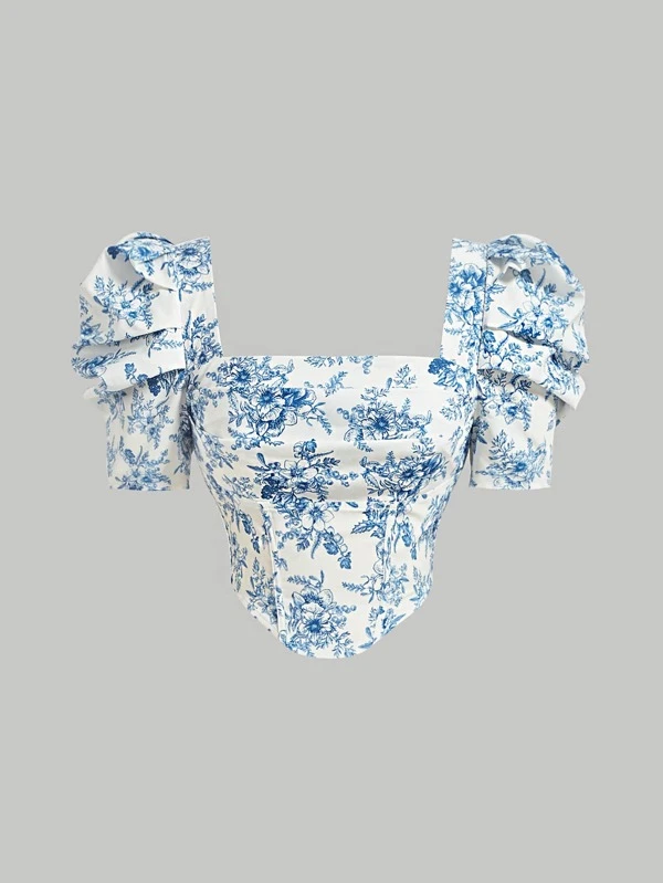 SHEIN MOD Floral Print Square Neck Puff Sleeve Bandana Hem Crop Blouse