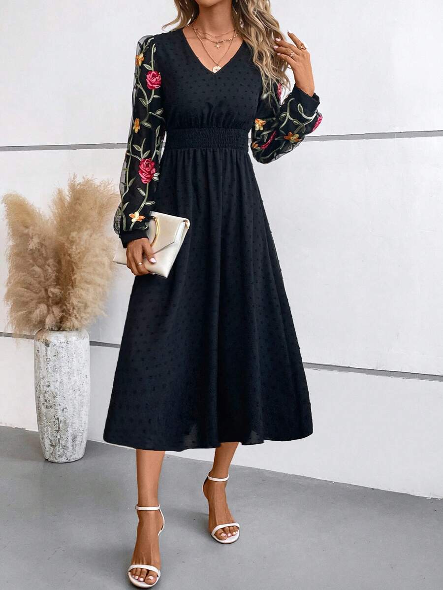 Floral Print Swiss Dot Puff Sleeve A-line Dress