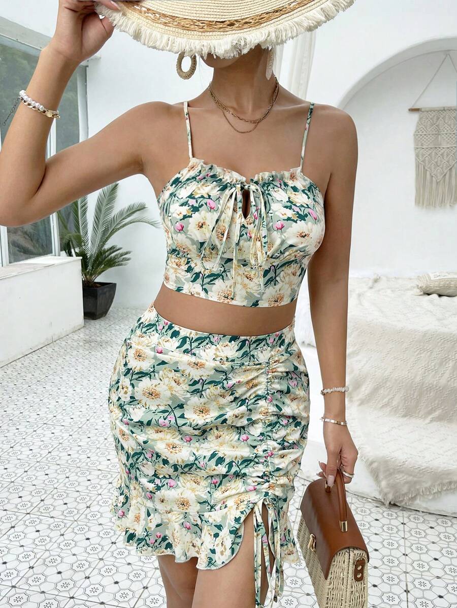 SHEIN VCAY Floral Print Tie Front Cami Top & Drawstring Ruffle Hem Skirt