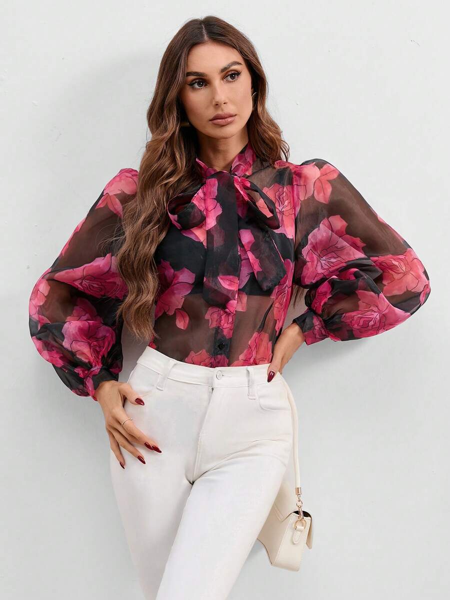 Floral Print Tie Neck Lantern Sleeve Organza Blouse Without Bra