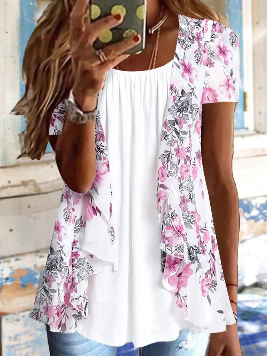 Floral Printed Splicing 2 In 1 Design Plus Size T-Shirt