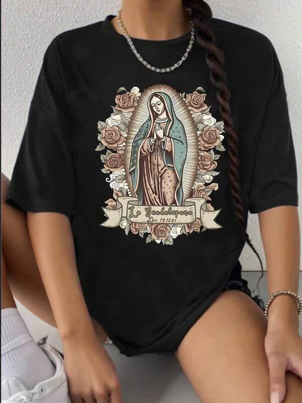 Flower, Letter & Virgin Mary Print T-Shirt