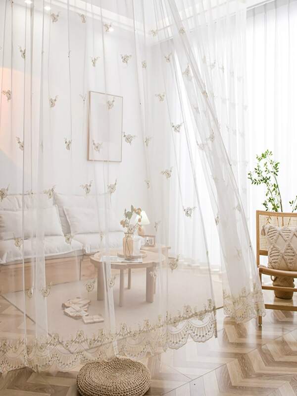 Flower Embroidered Faux Pearl Decor Single Panel Sheer Curtain