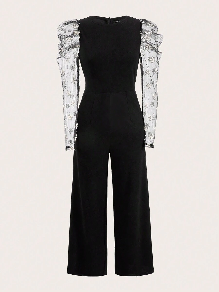 SHEIN Clasi Flower Mesh Gigot Sleeve Wide Leg Jumpsuit Without Belt