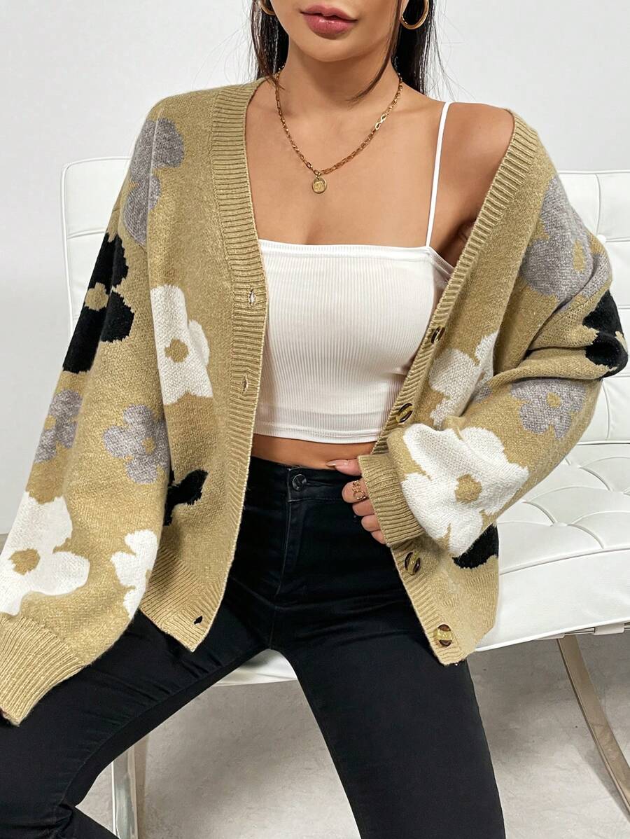 SHEIN Frenchy Flower Pattern Drop Shoulder Cardigan With Open Front