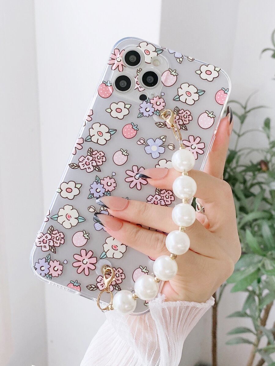 Flower Pattern Phone Case With Faux Pearl Hand Strap