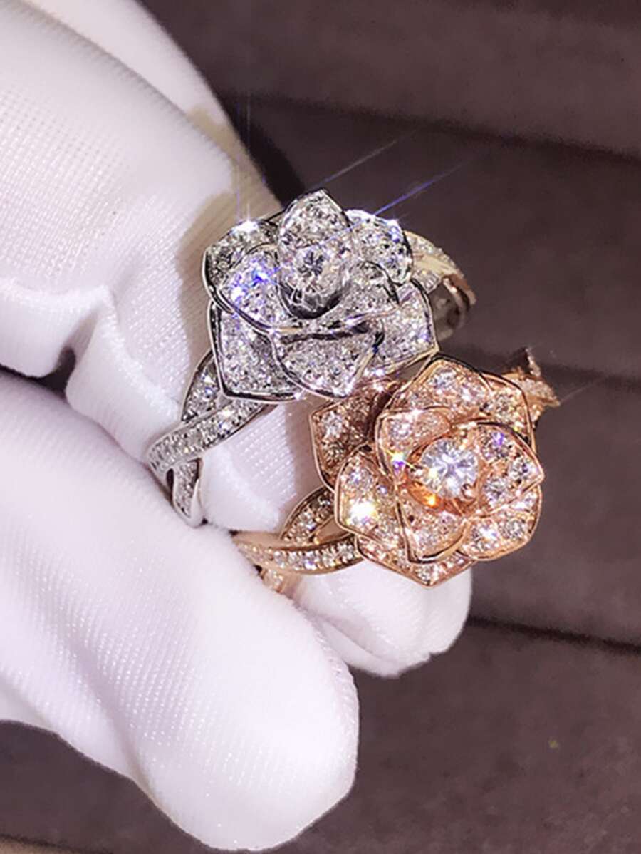Flower Shaped Crystal & Cubic Zirconia Filled Micro-inlay Ring For Women, Suitable For Wedding