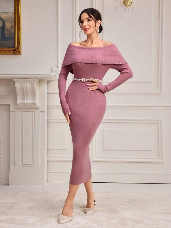 SHEIN Modely Foldover Off Shoulder Sweater Dress Without Belt