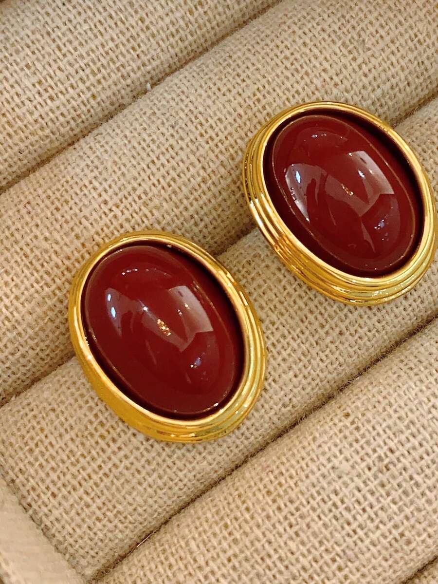 French Retro Oval Earrings, Simple Red Temperament Earrings, High-End Hong Kong Style Retro Earrings For Women