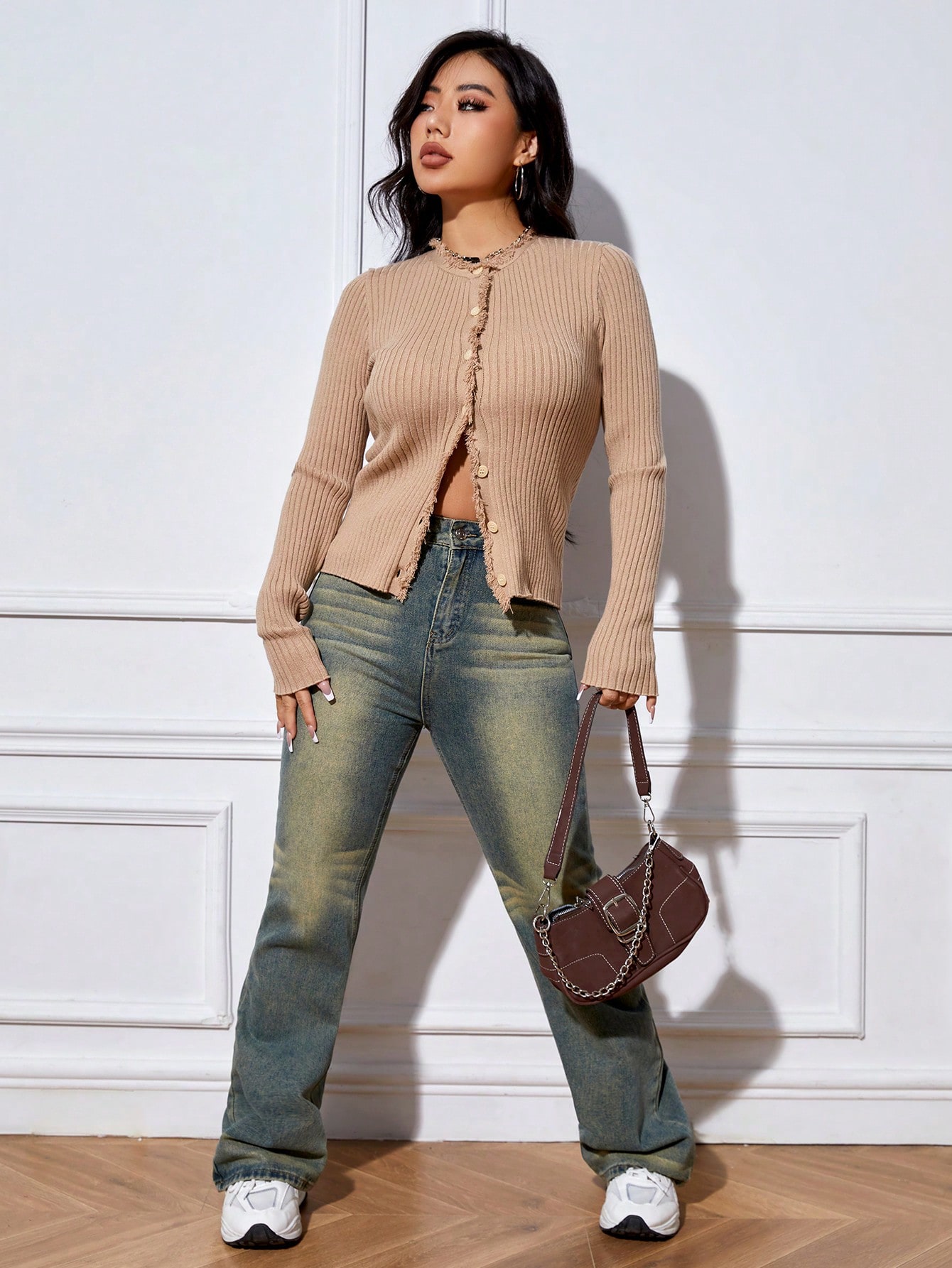 SHEIN Coolane Frill Trim Button Front Ribbed Knit Cardigan