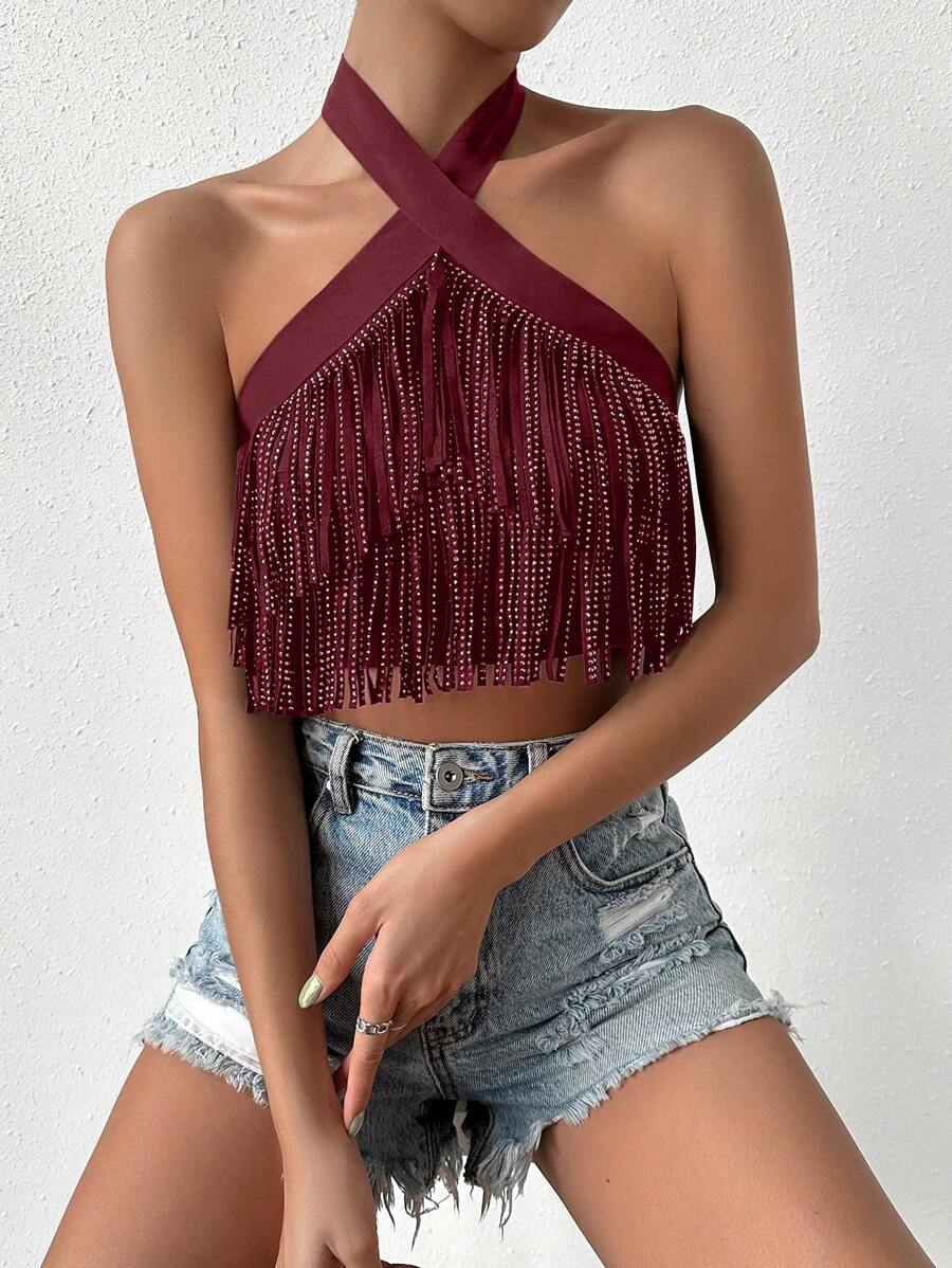 SHEIN BAE Fringe Trim Crisscross Tie Backless Crop Halter Top