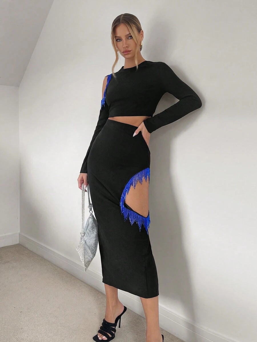 SHEIN Privé Fringe Trim Crop Tee & Pencil Skirt