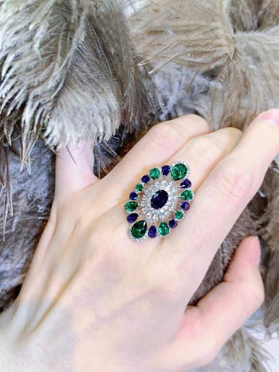 Full Rhinestone Open-Ended Ring For Women With Artificial Emerald Gemstone, Retro Palace Style
