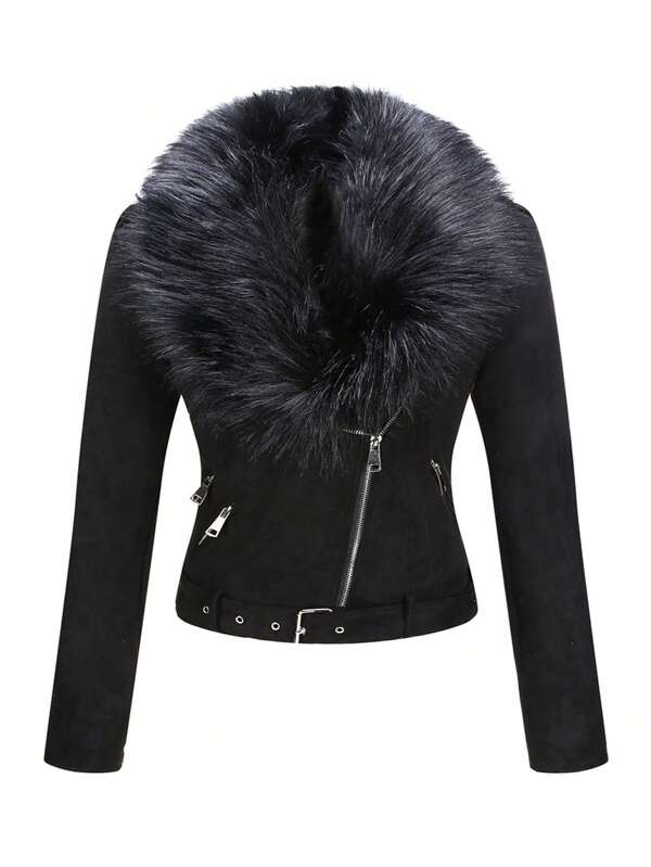 Fuzzy Collar Zip Up Belted Hem Suedette Jacket