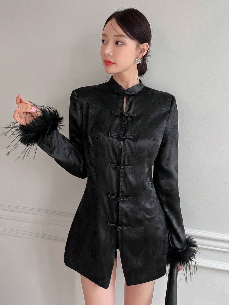 SHEINNeu Fuzzy Cuff Frog Button Front Mandarin Collar Coat