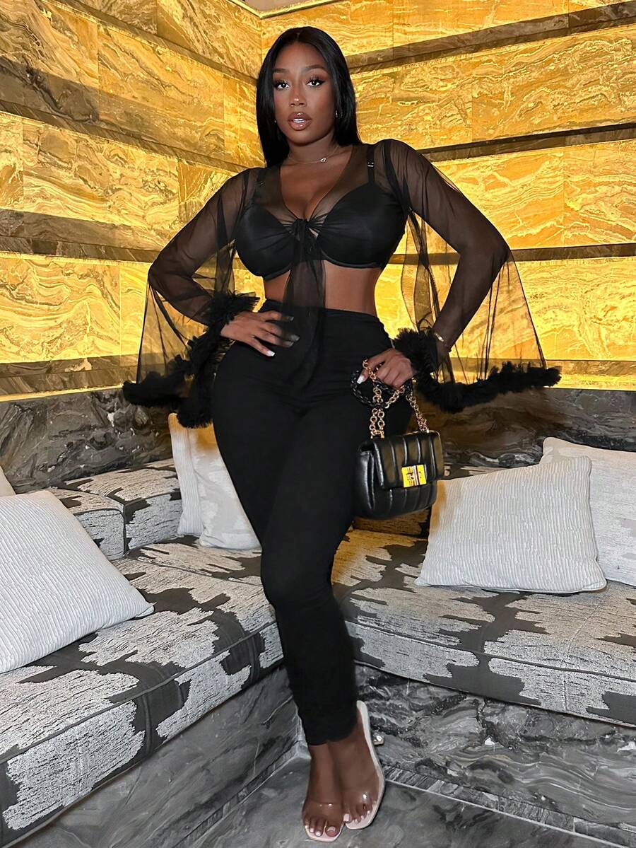 SHEIN Slayr Fuzzy Cuff Trumpet Sleeve Knot Front Crop Mesh Top Without Bra