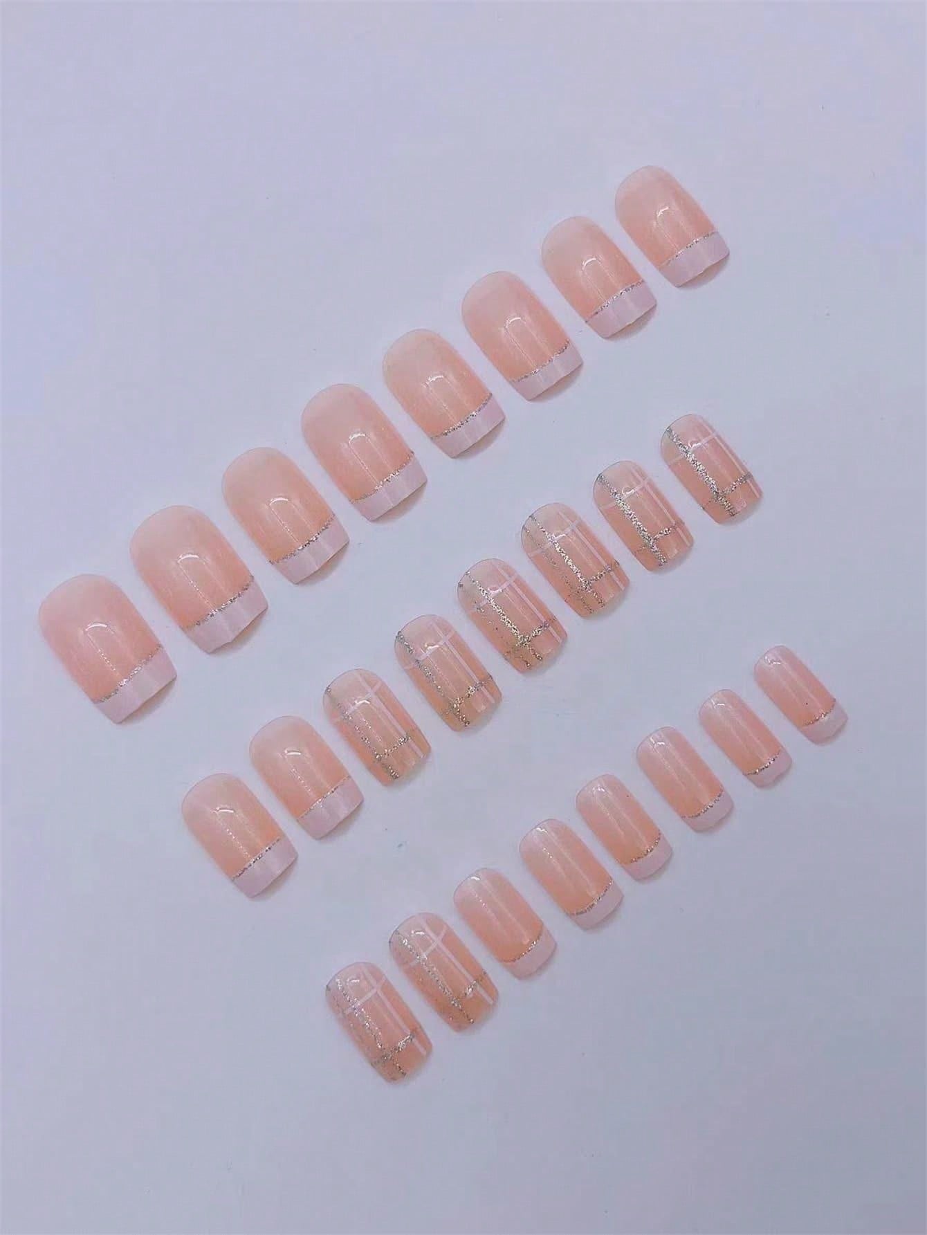 Gentle French Square Fake Nails Light Pink Line Well Pattern Glue On Full Coverage Nail Decor Women Girl 24Pcs