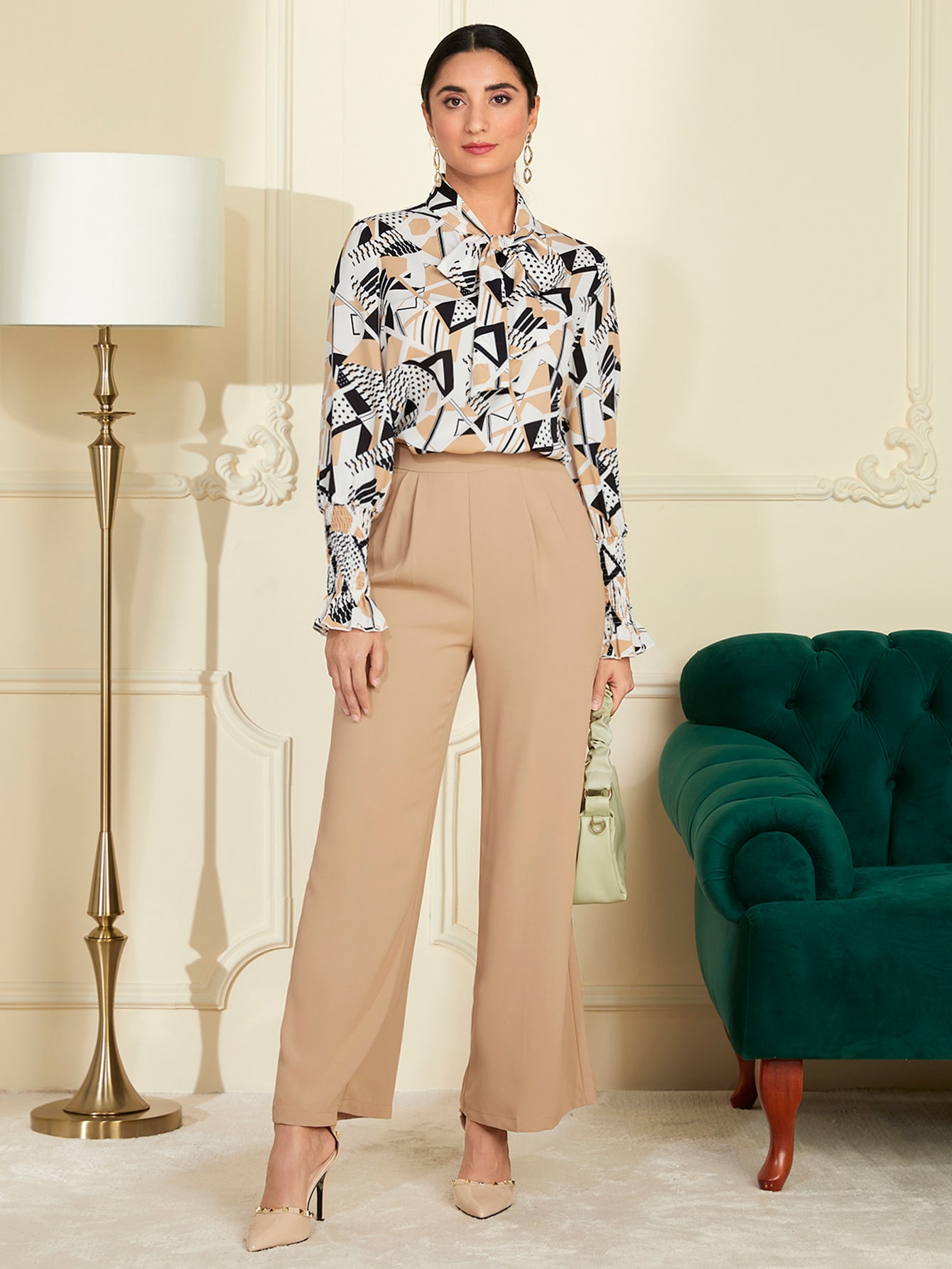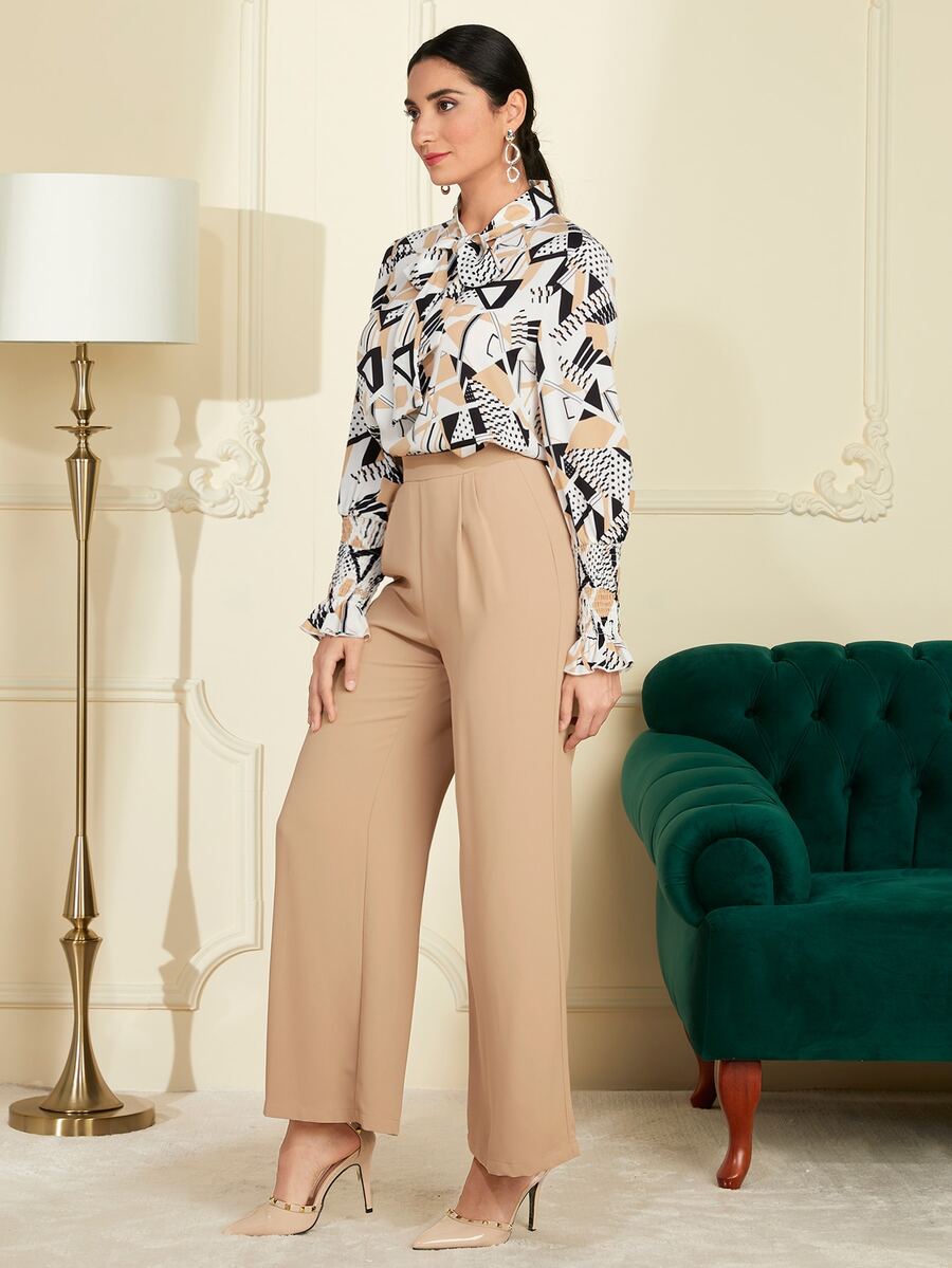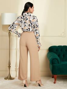 SHEIN Modely Geo Print Tie Neck Flounce Sleeve Top & Pants