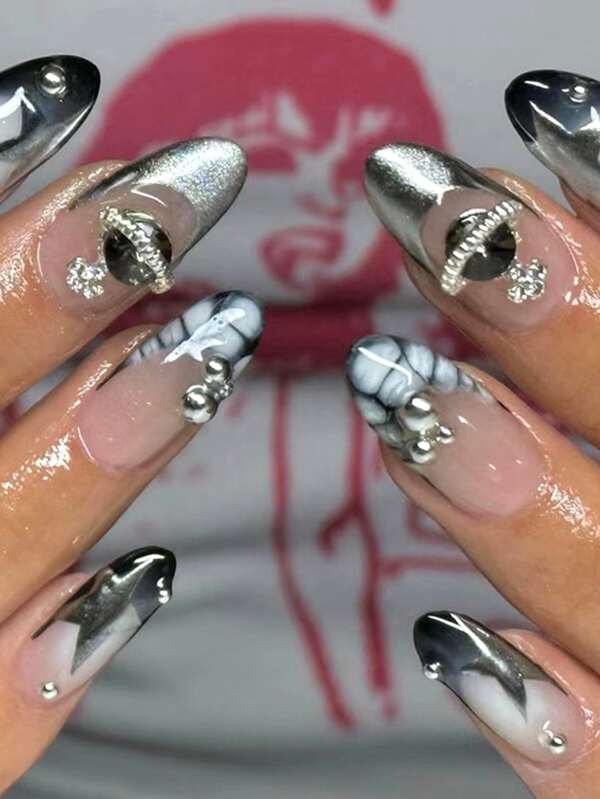 Get Glamorous with 24pcs Long Almond Silver Glitter Mirror French Steel Ball 3D Planet Saturn Decor Fake Nail & 1pc Nail File & 1sheet Nail Tape