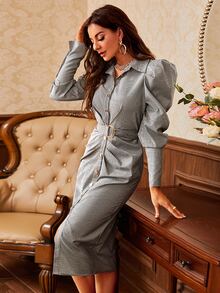 SHEIN Modely Gigot Sleeve Plaid Ruched Buckled Belted Dress