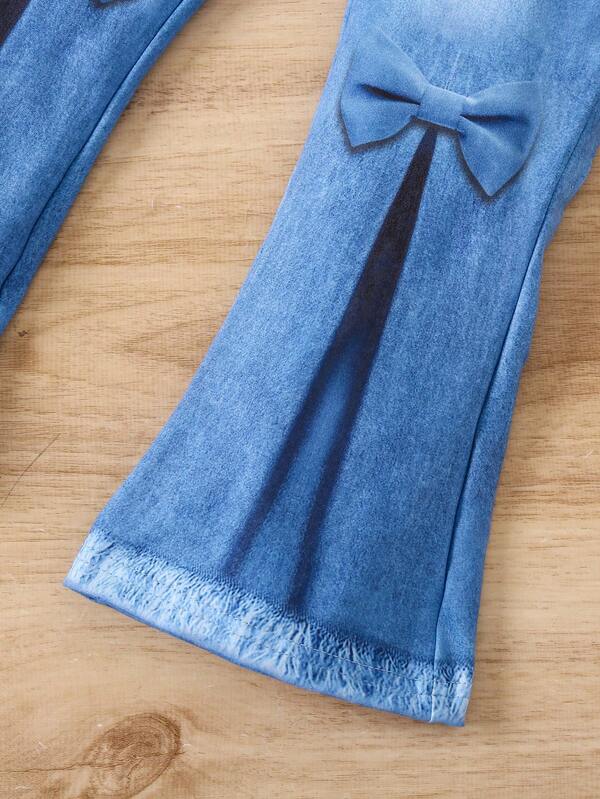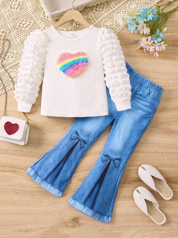 Girl'S Heart-Stamped Textured T-Shirt And Imitation Denim Printed Bell-Bottom Pants Set
