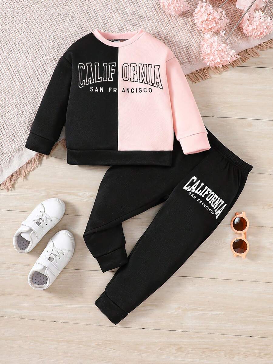 Girls' 2pcs/Set Casual Sportswear, Colorblock Letter Print Sweatshirt And Sports Pants, Suitable For Autumn And Winter