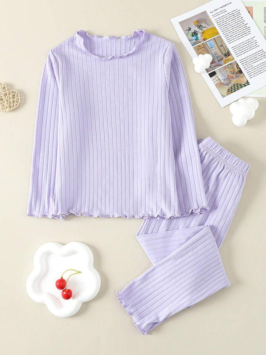 Girls' Casual Solid & Stripe Patterned Round Neck Long-Sleeved T-Shirt And Pants For Home Wear