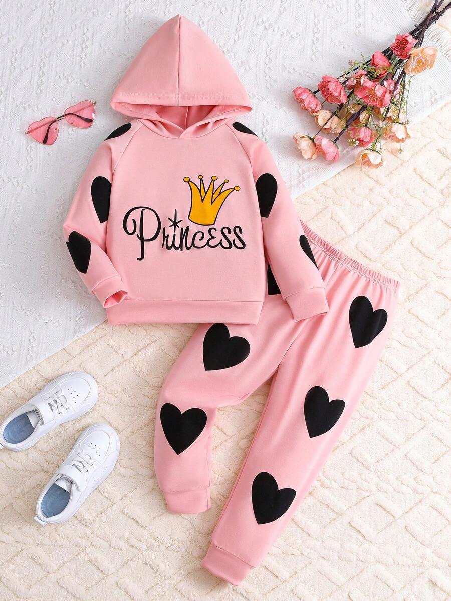 SHEIN Kids CHARMNG Girls' Cute Heart Patterned Hoodie And Pants Set