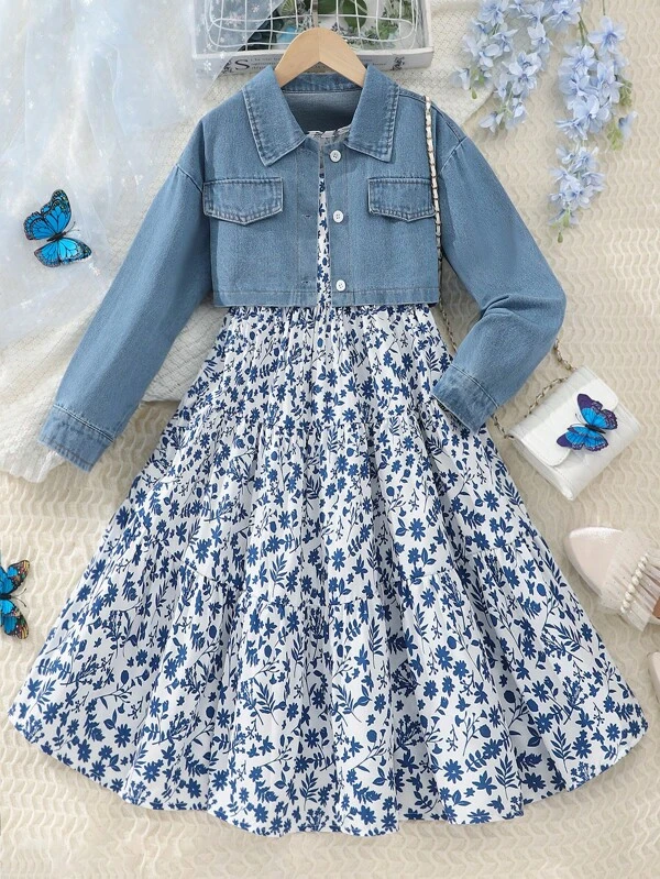 Girls' Denim Jacket & Floral Dress Set