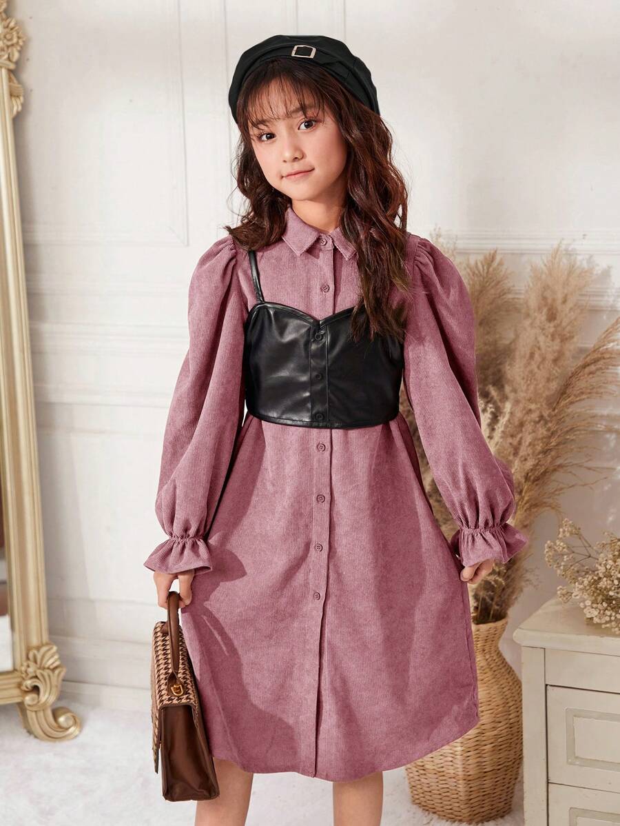 SHEIN Girls' Elegant Loose Fit Pu Spaghetti Straps & Corduroy Patchwork Shirt Dress