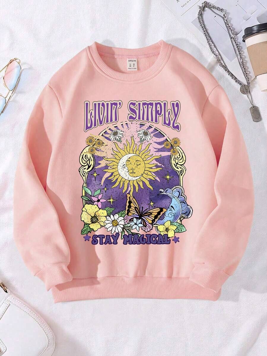 Girls' Floral & Butterfly Printed Round Neck Sweatshirt For Autumn
