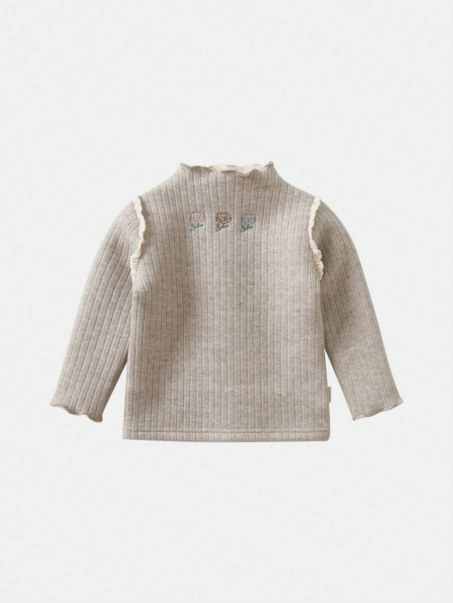 Girls' Floral Embroidered Drop Shoulder Ribbed Sweater
