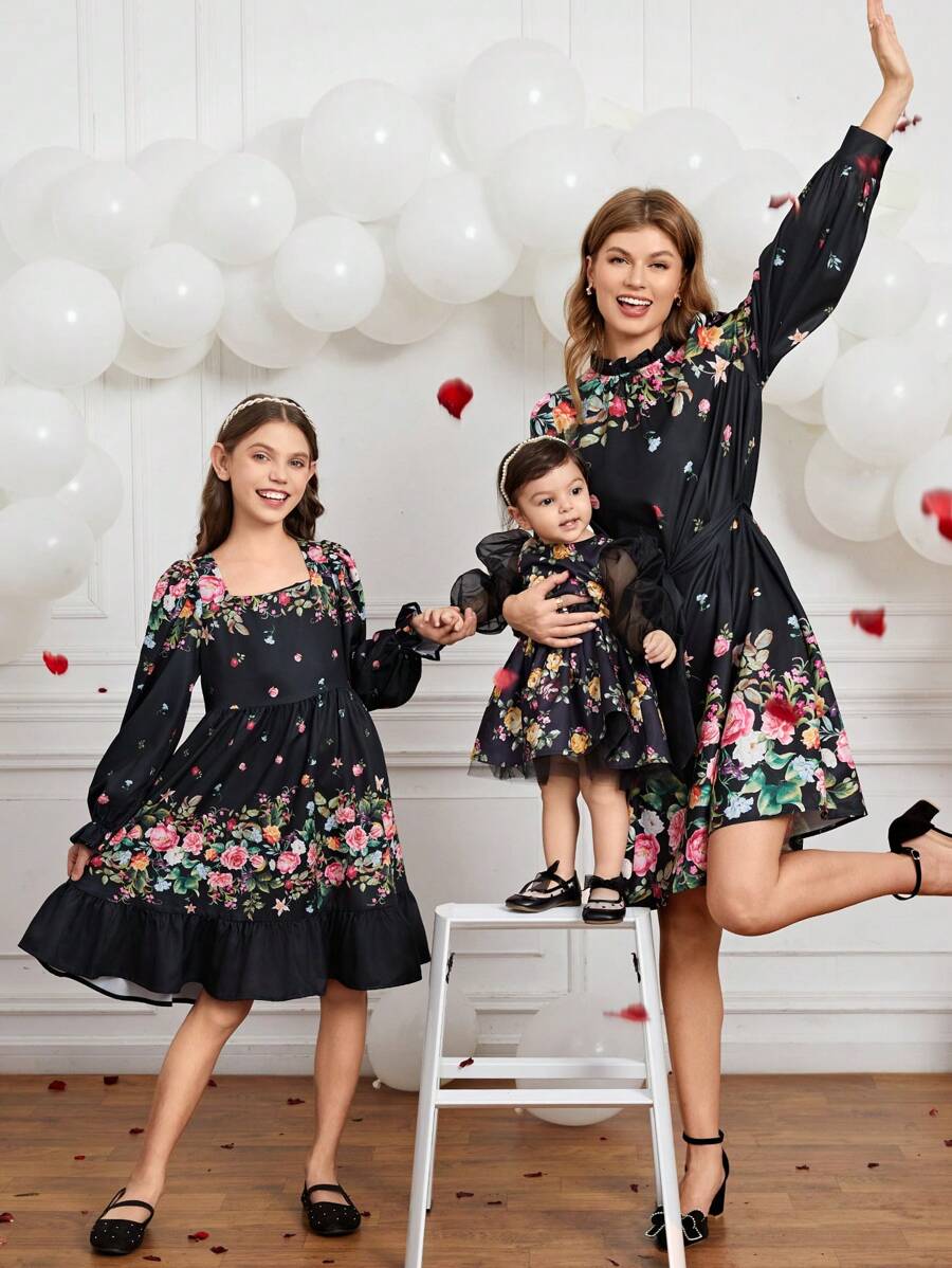 SHEIN Kids CHARMNG Girls' Floral Print Square Neck Long Sleeve Fashionable Casual Dress, Mommy And Me Matching Outfits (3 Pieces Sold Separately)