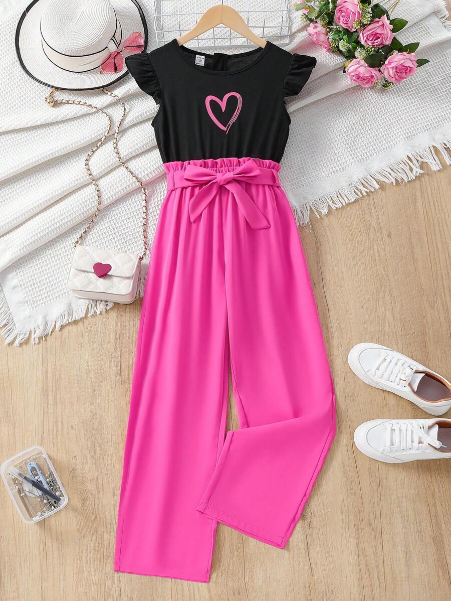SHEIN Kids Cooltwn Girls' Heart Print Flutter Sleeve Knit Splicing Jumpsuit