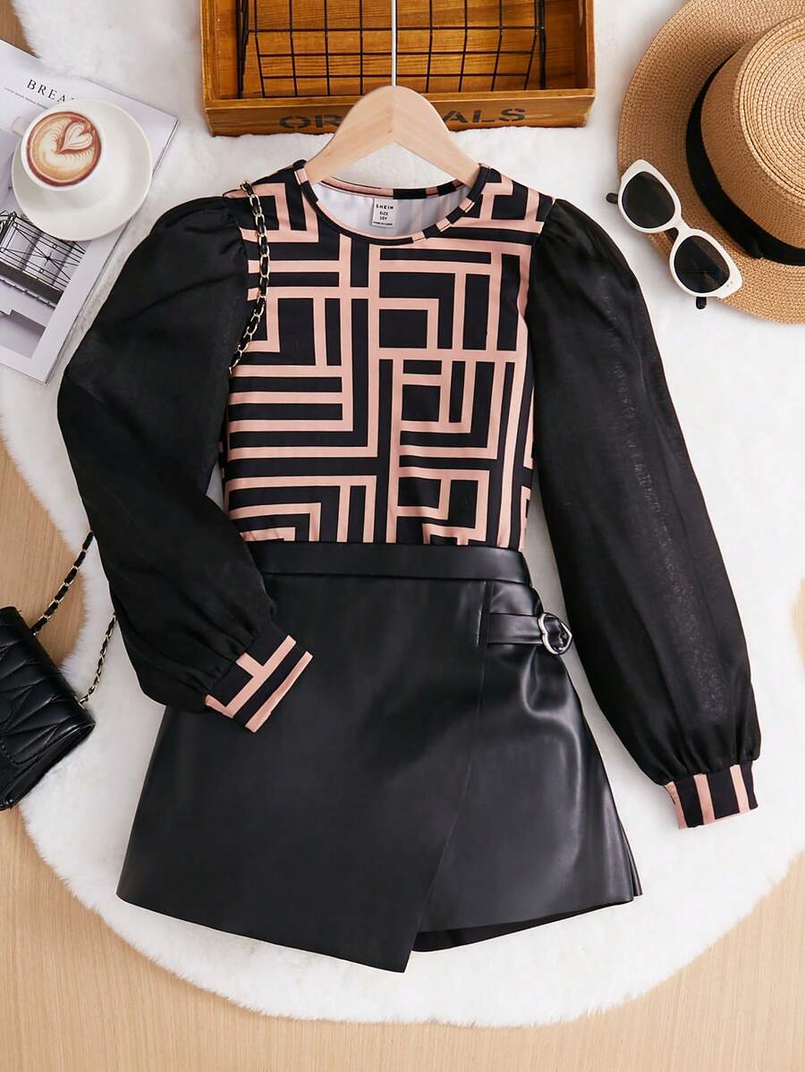 SHEIN Kids FANZEY Girls' Knit Geometric Pattern Round Neck Pullover With Bubble Sleeves And Pu Leather Skirt Set