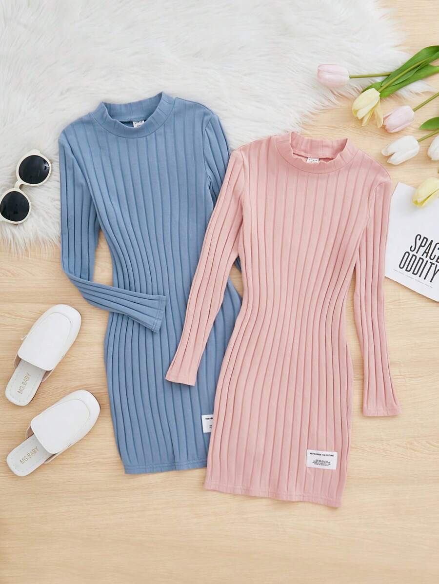 SHEIN Girls' Knitted Solid Color Dress With Small Stand Collar & Patch Detail, 2pcs/set