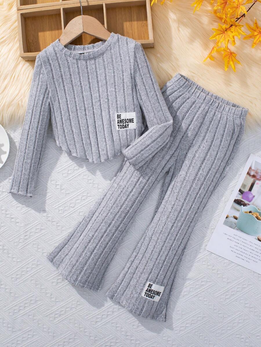 SHEIN Kids EVRYDAY Young Girl Knitted Solid Color Stand-Up Collar Fitted Casual Top And Knitted Solid Color Fitted Flared Trousers Two-Piece Set