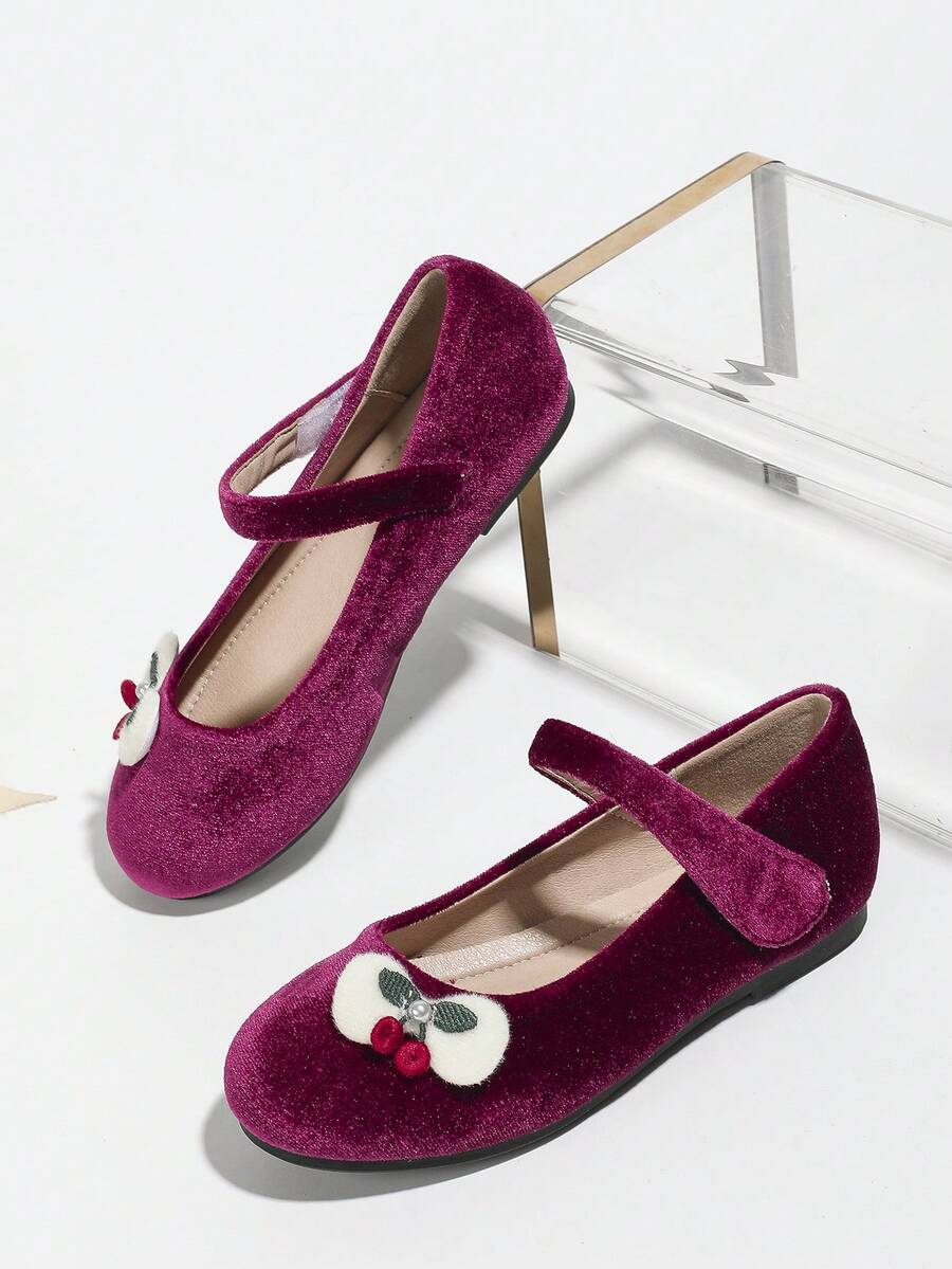 Girls' Korean Style Shallow Flat Casual Shoes, Autumn & Winter, Teenagers Cherry Red Velvet Ballerina Shoes For Dance Performance And School