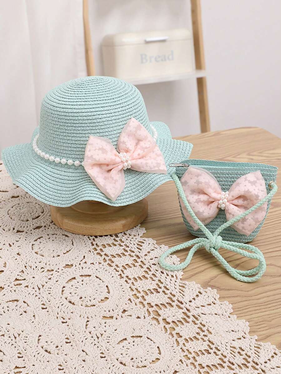 Girls' Princess Style Straw Hat Set, Including Pink Pearl Decor Bowknot Sunhat And Bag, Suitable For Daily Wear/Outdoor Beach Play